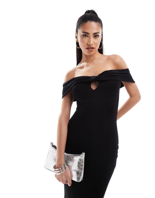 ASOS DESIGN – Svart midiklänning med rosett och bardotringning