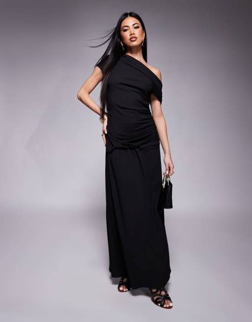 ASOS DESIGN – Svart midiklänning med sänkt axelsöm, rysch och asymmetrisk midja