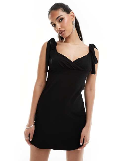 ASOS DESIGN – Svart, mjuk miniklänning med hjärtformad halsringning och rosetter på axelbanden