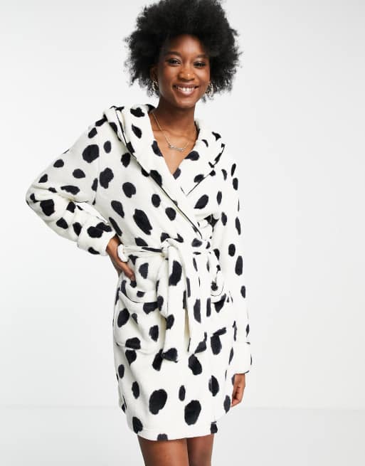 ASOS DESIGN – Svart och krämvit, djurmönstrad morgonrock i supermjuk fleece
