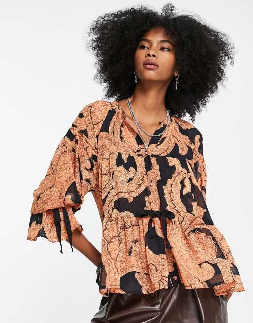 ASOS DESIGN – Svart och orange paisleymönstrad, skir blus med knytning