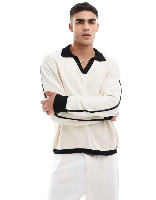 ASOS DESIGN– Svart och stenfärgad stickad tröja i bomullsmix med kontrasterande krage och muddar