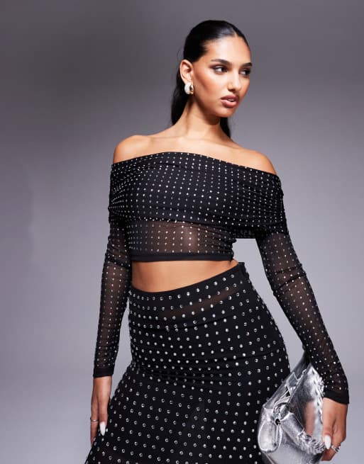 ASOS DESIGN – Svart off shoulder-topp med långa ärmar och hotfix