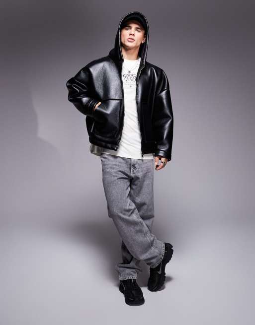 ASOS DESIGN – Svart pilotjacka i extra oversize och boxig passform av läderimitation med huva och teddyfoder