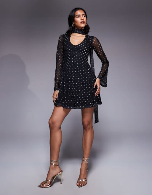 ASOS DESIGN – Svart, prickig miniklänning i mesh med utsvängda ärmar och scarf