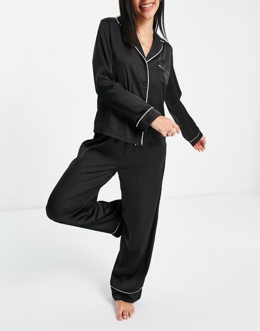 ASOS DESIGN – Svart pyjamas i satin med långärmad skjorta och byxor