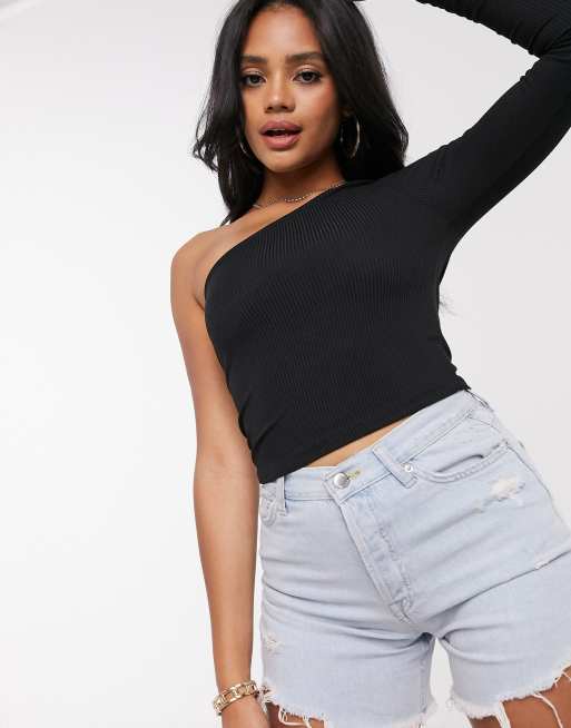 ASOS DESIGN – Svart ribbad enaxlad topp med lång ärm