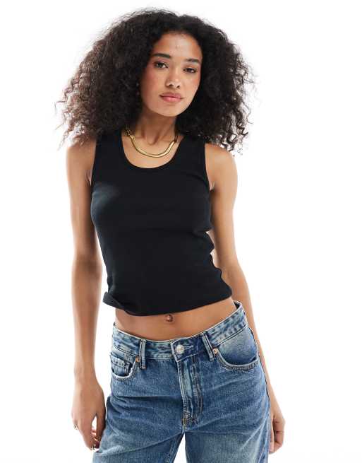 ASOS DESIGN – Svart, ribbat linne med djup halsringning