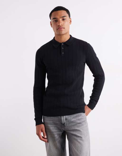 ASOS DESIGN – Svart, ribbstickad pikétröja i muscle fit med långa ärmar
