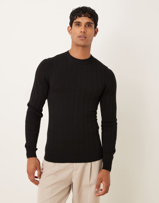 ASOS DESIGN – Svart, ribbstickad t-shirt i muscle fit med långa ärmar