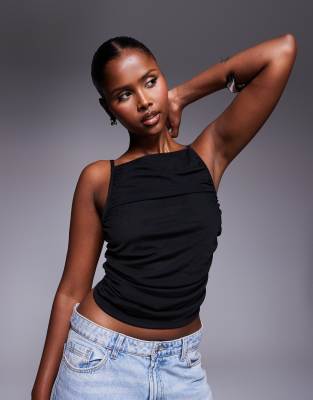 ASOS DESIGN – Svart, ryschad topp i mesh med smala axelband