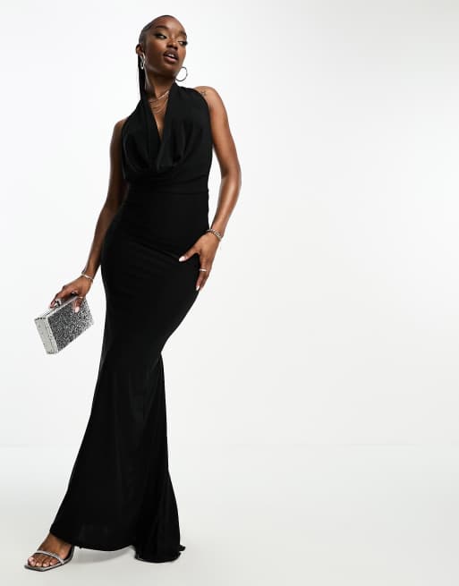 ASOS DESIGN – Svart, silkig maxiklänning med draperad ringning och extra djup urringning
