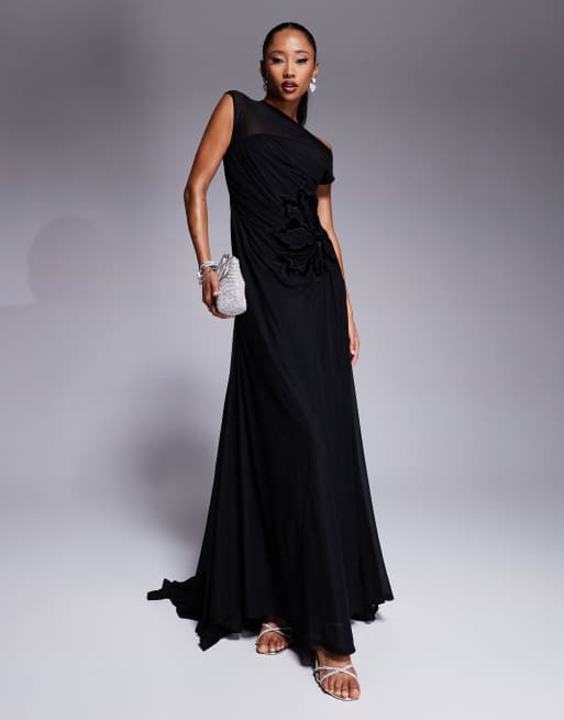 ASOS DESIGN – Svart, skir maxiklänning med påsydd blomma och släp