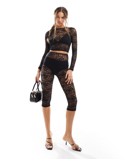 ASOS DESIGN – Svart spetsset med crop top med rund halsringning och leggingsshorts