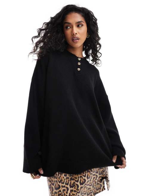 ASOS DESIGN – Svart, stickad, henley-tröja i oversize med kontrasterande knappsprund