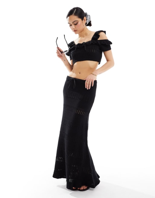 ASOS DESIGN – Svart stickat set med linne och midikjol med knytdetalj