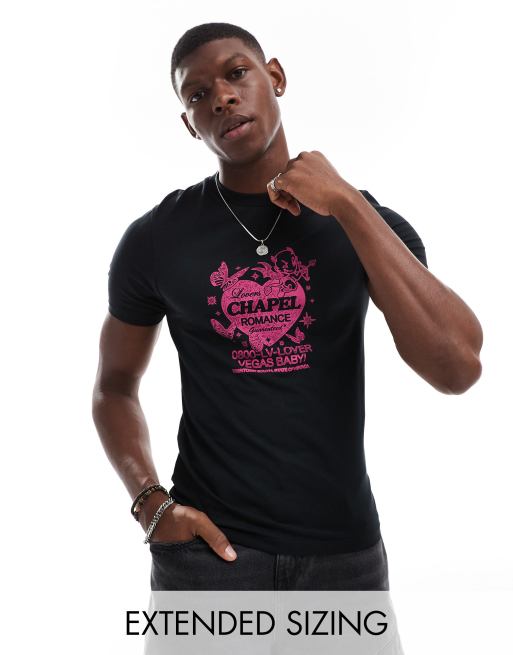 ASOS DESIGN – Svart t-shirt i muscle fit med tryck framtill