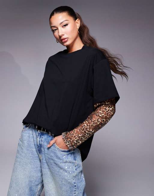 ASOS DESIGN – Svart t-shirt i oversize och ärmar i leopardmönstrad spets