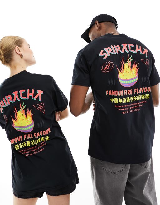 ASOS DESIGN – Svart t-shirt i unisex-modell med stort licensierat Sriracha-tryck baktill