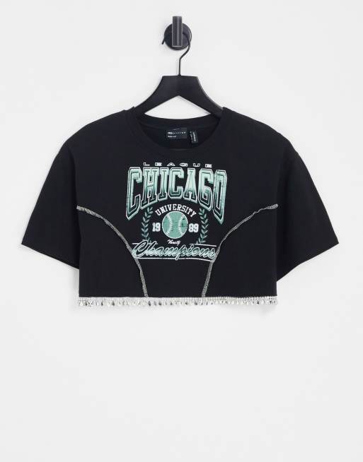 ASOS DESIGN – Svart T-shirt med Chicago-collegetryck och strasskant