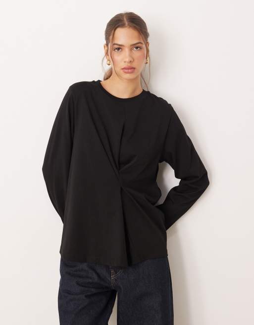 ASOS DESIGN – Svart t-shirt med långa ärmar och invikt detalj