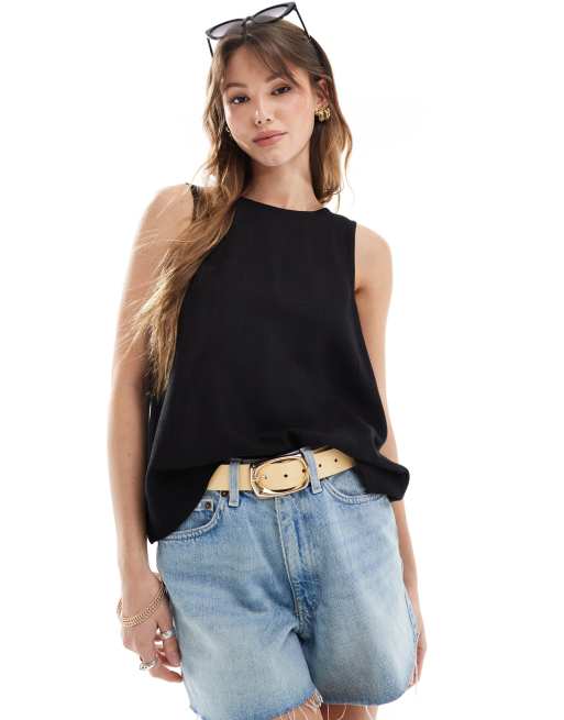ASOS DESIGN – Svart topp i linneblandning med djup halsringning