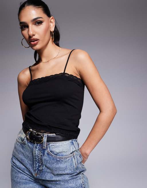 ASOS DESIGN – Svart topp med spetskant och smala axelband