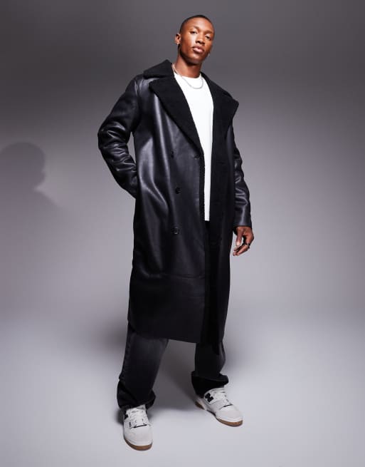 ASOS DESIGN – Svart trenchcoat i läderimitation med teddyfoder