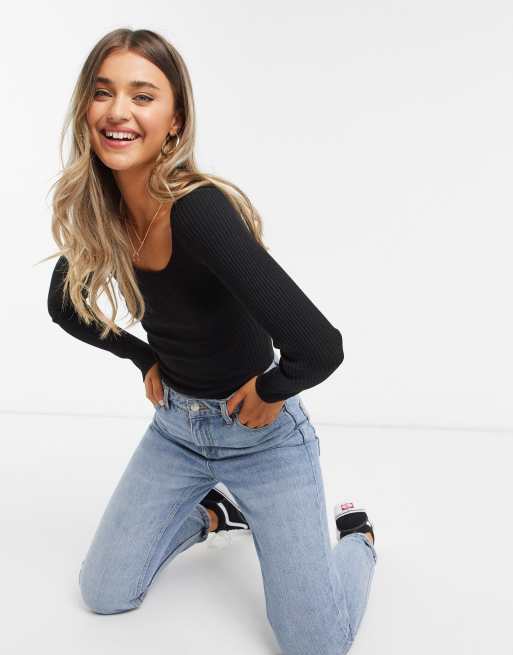 ASOS DESIGN – Svart tröja med djup halsringning och lång ärm