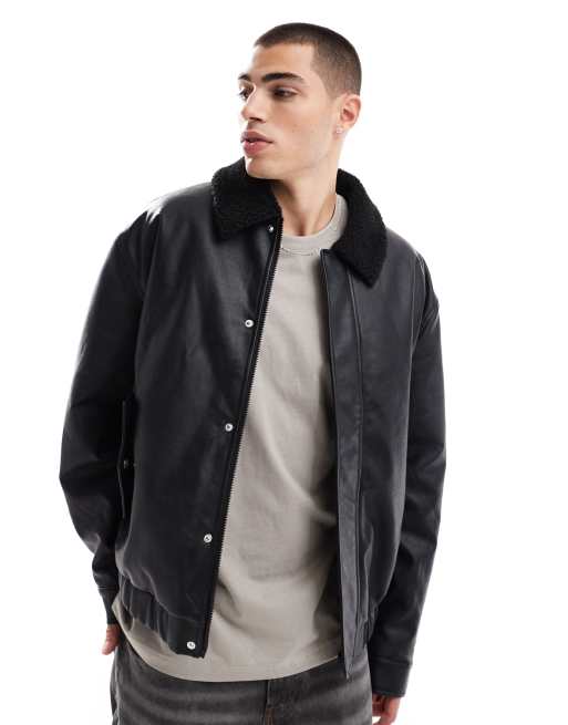 ASOS DESIGN – Svart, vadderad harrington-jacka med teddykrage i läderimitation