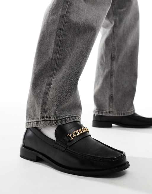 ASOS DESIGN – Svarta loafers i läder med fyrkantig tå och guldfärgad kedja