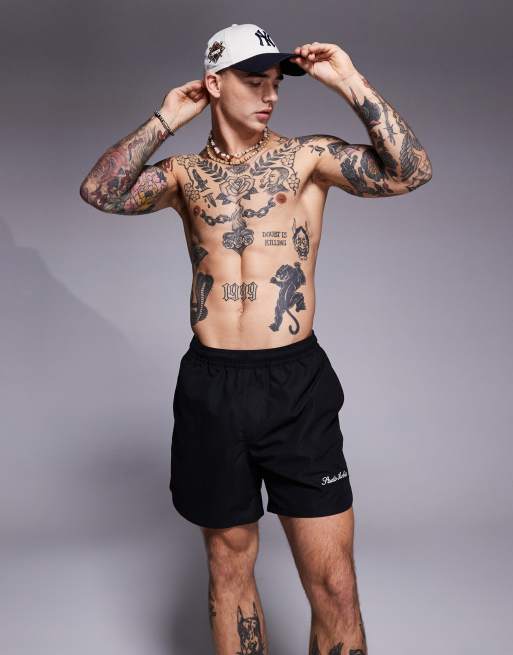 ASOS DESIGN – Svarta, mellanlånga badshorts med broderi