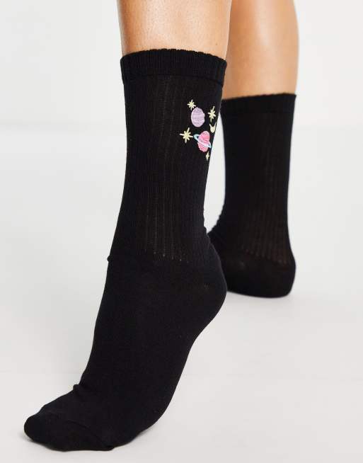 ASOS DESIGN – Svarta ribbade strumpor i vadhög modell med broderad planet
