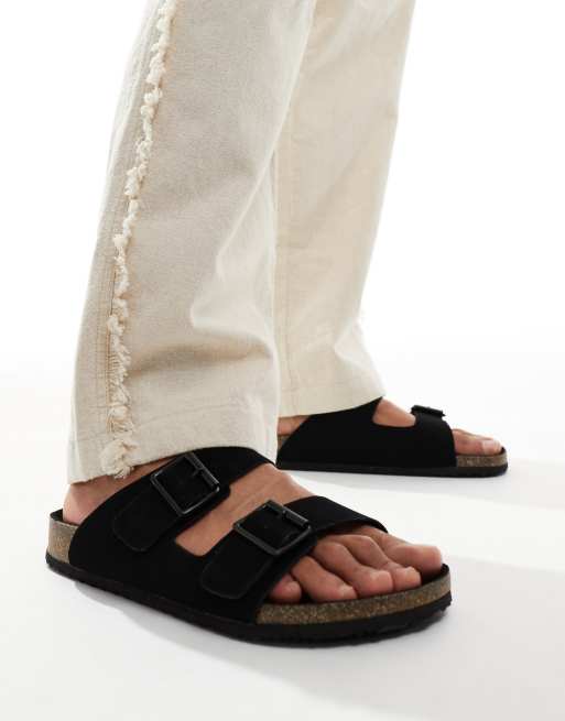 ASOS DESIGN – Svarta sandaler med två remmar och korksula i mockaimitation