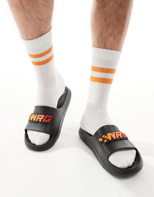 ASOS DESIGN – Svarta tofflor med motocrossmärke