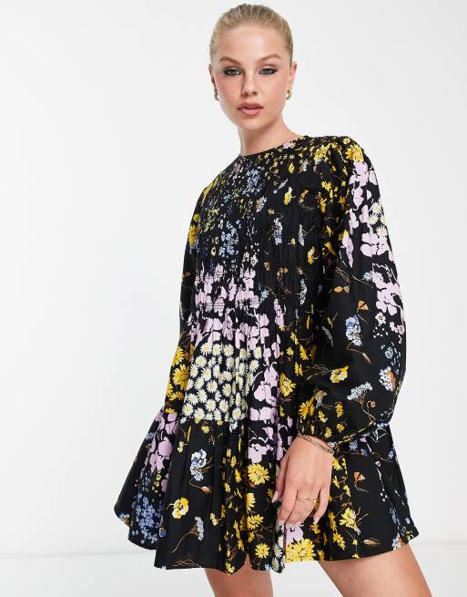ASOS DESIGN – Svartmönstrad kort smockklänning i bomull
