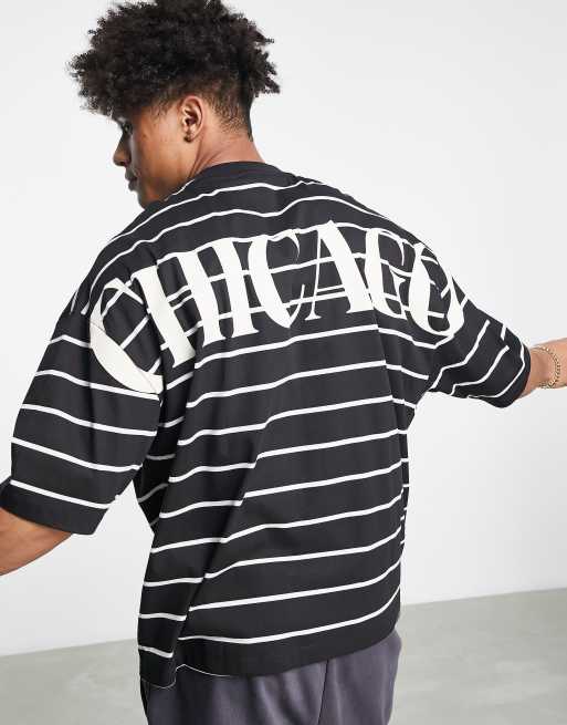 ASOS DESIGN – Svartrandig t-shirt i oversize med Chicago-tryck baktill