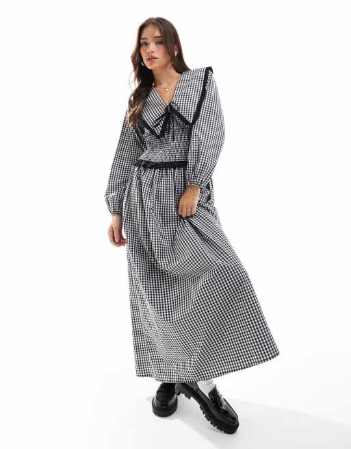 ASOS DESIGN – Svartvit, ginghamrutig maxiklänning med krage och smockad midja