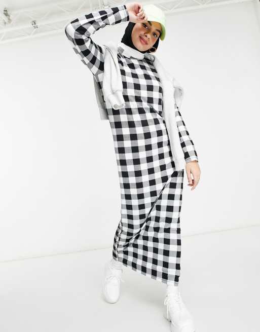 ASOS DESIGN – Svartvit ginghamrutig t-shirtklänning i maxilängd med lång ärm