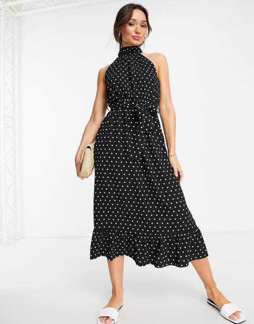 ASOS DESIGN – Svartvit, prickig skaterklänning i maxilängd med halterneck och skärp