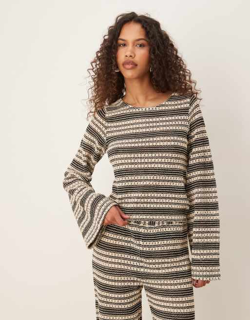 ASOS DESIGN – Svartvit, randig, hålvirkad topp med långa ärmar, öppen rygg och knytning, del av set