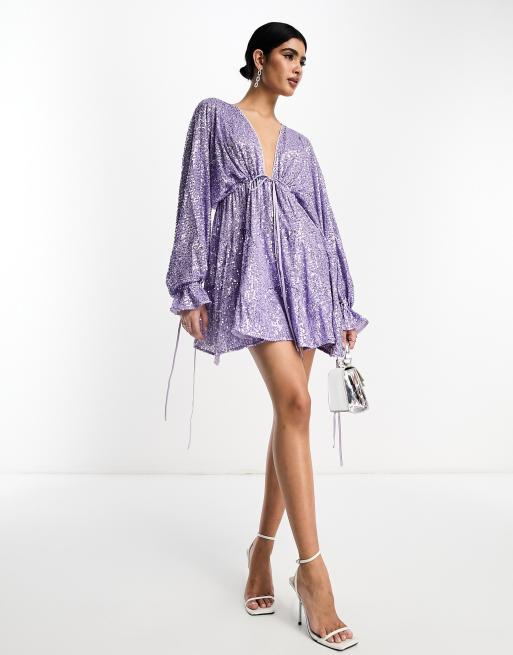 ASOS DESIGN – Syrénlila, panelsydd miniklänning med utsmyckning, paljetter och knytband