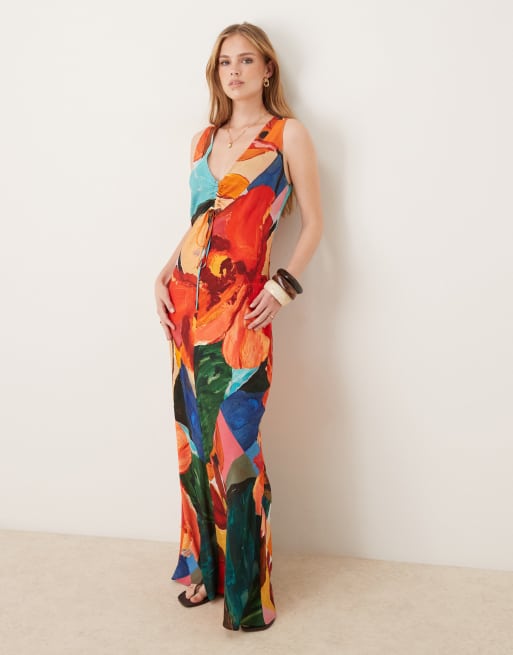 ASOS DESIGN – V-ringad midiklänning med rysch, knytning och abstrakt blommönster