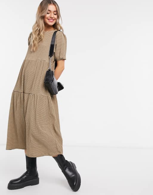 ASOS DESIGN vadlång klänning med sydda våder med rutmönster i kamel och svart