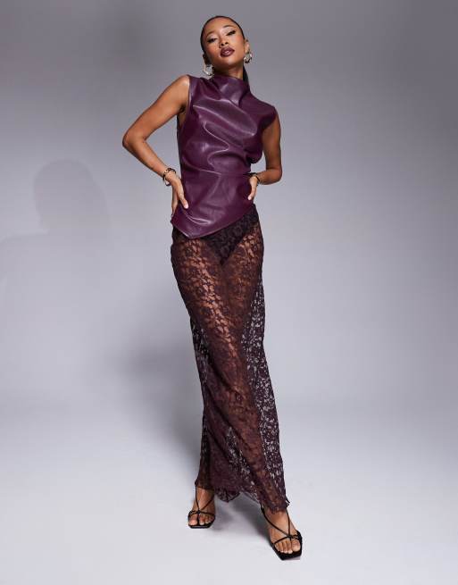ASOS DESIGN – Vinröd, diagonalskuren maxikjol i spets