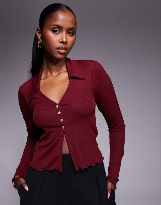 ASOS DESIGN – Vinröd, halvskir skjorta med långa ärmar