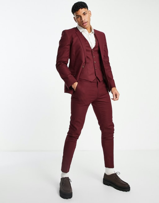 ASOS DESIGN – Vinröd kostym i linnemix med supersmal passform