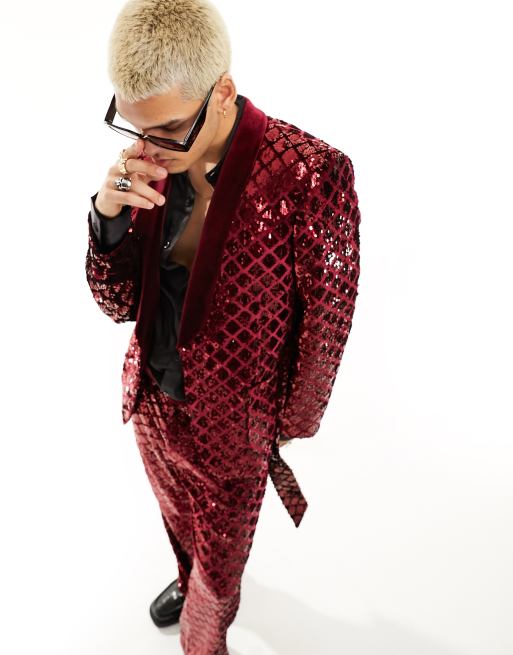 ASOS DESIGN – Vinröd kostymjacka av sammet i extra smal passform med diamantpaljetter