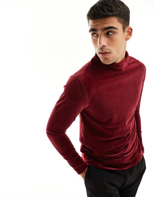 ASOS DESIGN - Vinröd, långärmad t-shirt av velour i muscle fit med halvpolokrage