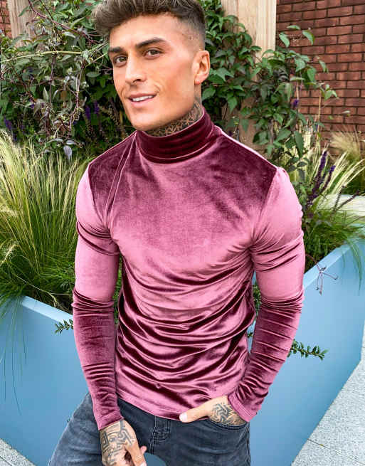 ASOS DESIGN – Vinröd långärmad t-shirt i velour med muscle-passform, stretch och polokrage